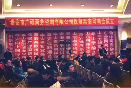 2015年1月26日,泰安市網(wǎng)商協(xié)會(huì)成立大會(huì)在泰安寶龍福朋酒店隆重舉行。參會(huì)的有泰安市政府領(lǐng)導(dǎo)、泰山區(qū)區(qū)委書記和阿里巴巴北方區(qū)域、泰安市商務(wù)局、泰山區(qū)商務(wù)局、市建行、泰山學(xué)院、山東科技大學(xué)、市外網(wǎng)商會(huì)等多家單位的主要領(lǐng)導(dǎo)以及泰安網(wǎng)商會(huì)全體會(huì)員。